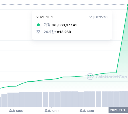 상승이 시작한지 3시간 30분만에 7,500% 가 추가로 오르며