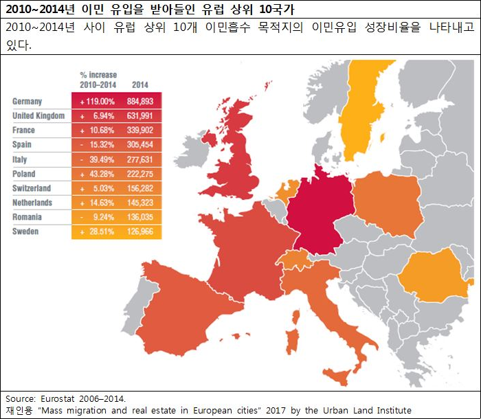 다음 표는 2010~2014년 사이 유럽 상위 10개 이민흡수 목적지의 이민 유입 증가비율을 나타내고 있다.