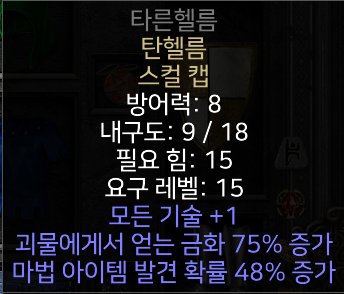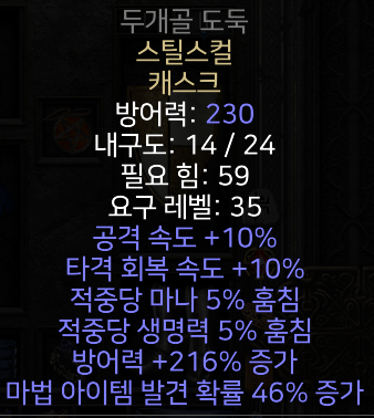 | 두개골 도둑 | 앵벌용 투구, 앵벌한다고 고생해서 앵벌용 두개나 주는건가? 매찬 46%(으뜸은 매찬 50%) 하지만 샤코가 있다면 밀리겠지만, 저렙 때 쓰기 괜찮음 |