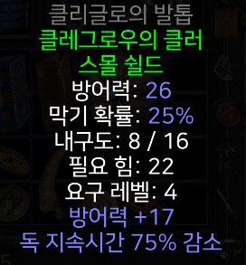 | 4 | 클리글로의 발톰 | 초저렙 세트아이템 방패 | 버림 |