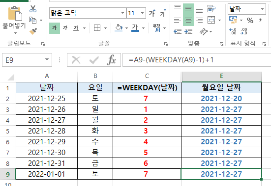 A2-(WEEKDAY(A2)-1) 여기까지 식을 보면,