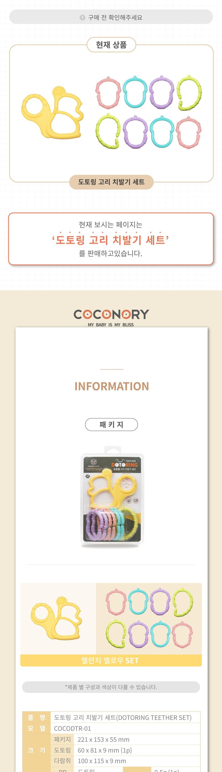 꼬꼬노리 열탕소독 가능 국내생산 도토링 고리 치발기 세트 플라스틱 패키지, 고리 치발기세트, 멜란지 엘로우, 1개
