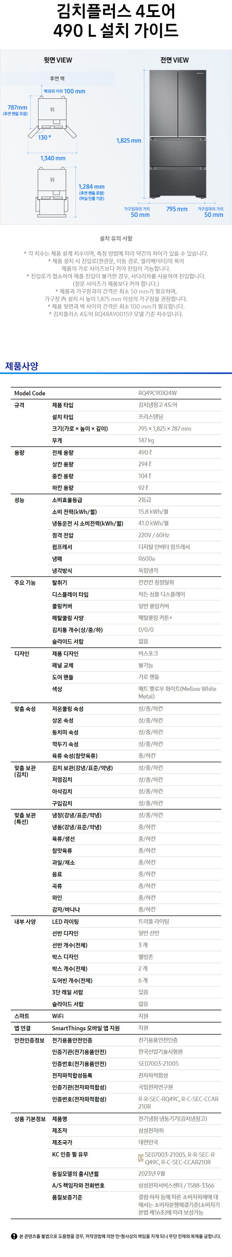 삼성전자 비스포크 김치플러스 스탠드형 4도어 냉장고 490L 방문설치, 매트 멜로우 화이트, RQ49C90X24W