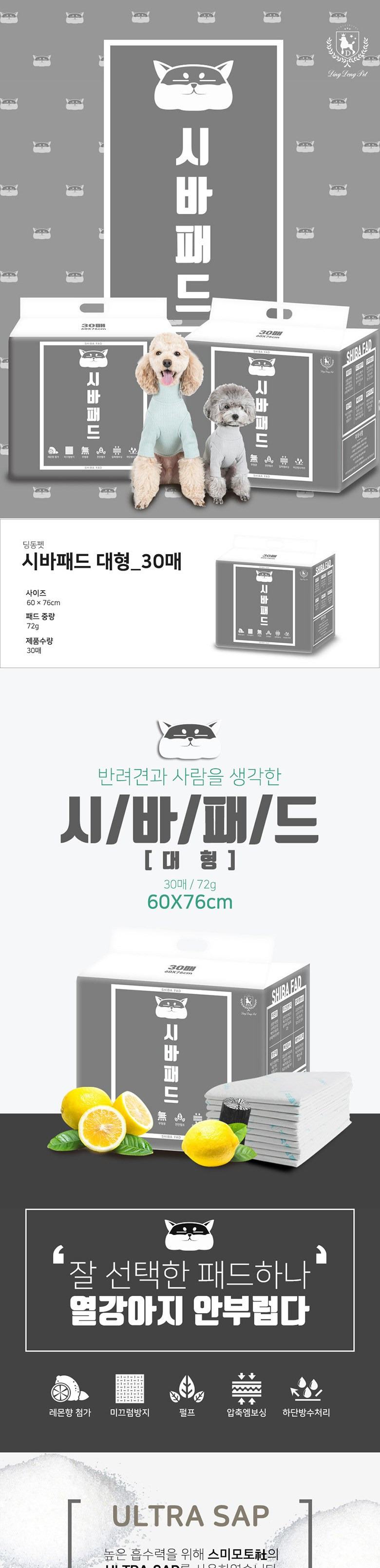 딩동펫 시바 애견 배변패드 레몬향, 30매, 2개
