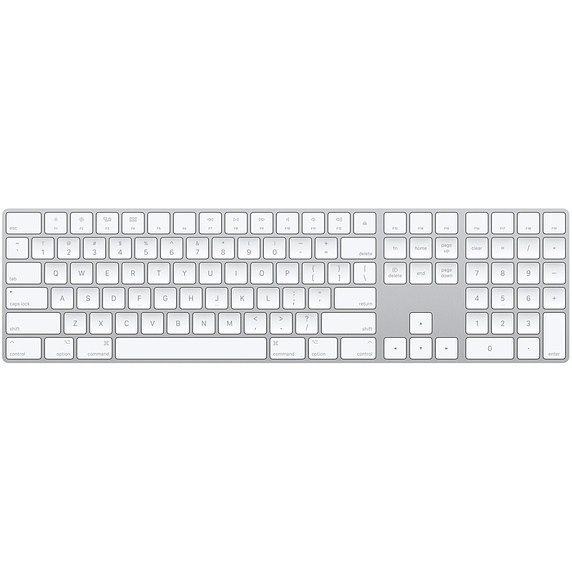 Magic Keyboard with Numeric Keypad는 빠른 스크롤을 위한 문서 탐색 컨트롤, 게임을 위한 풀 사이즈 방향키와 함께 확장 레이아웃을 제공합니다. 각각의 키 아래에 적용된 가위식 매커니즘이 향상된 안정성을 제공하며, 최적화된 키 트래블과 낮은 높이는 편안하고 정확한 타이핑 경험을 선사하죠. 숫자 키패드는 스프레드시트 및 금융 관련 응용 프로그램 등에서 작업할 때, 특히 큰 도움을 줍니다. 게다가 내장형 충전식 배터리는 한 번 충전으로 한 달 이상 사용할 수 있을 정도로 긴 사용 시간을 자랑하죠
