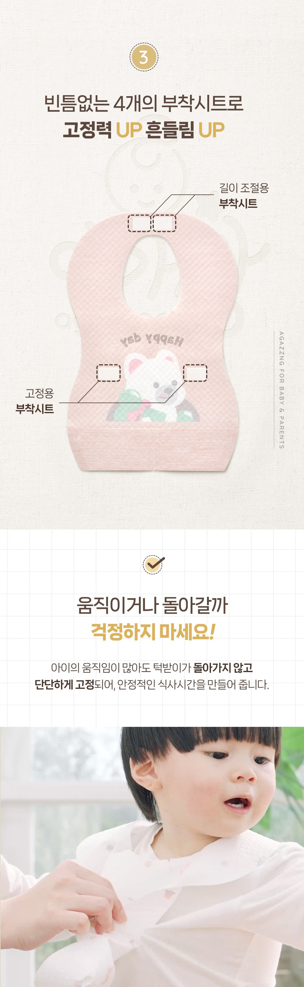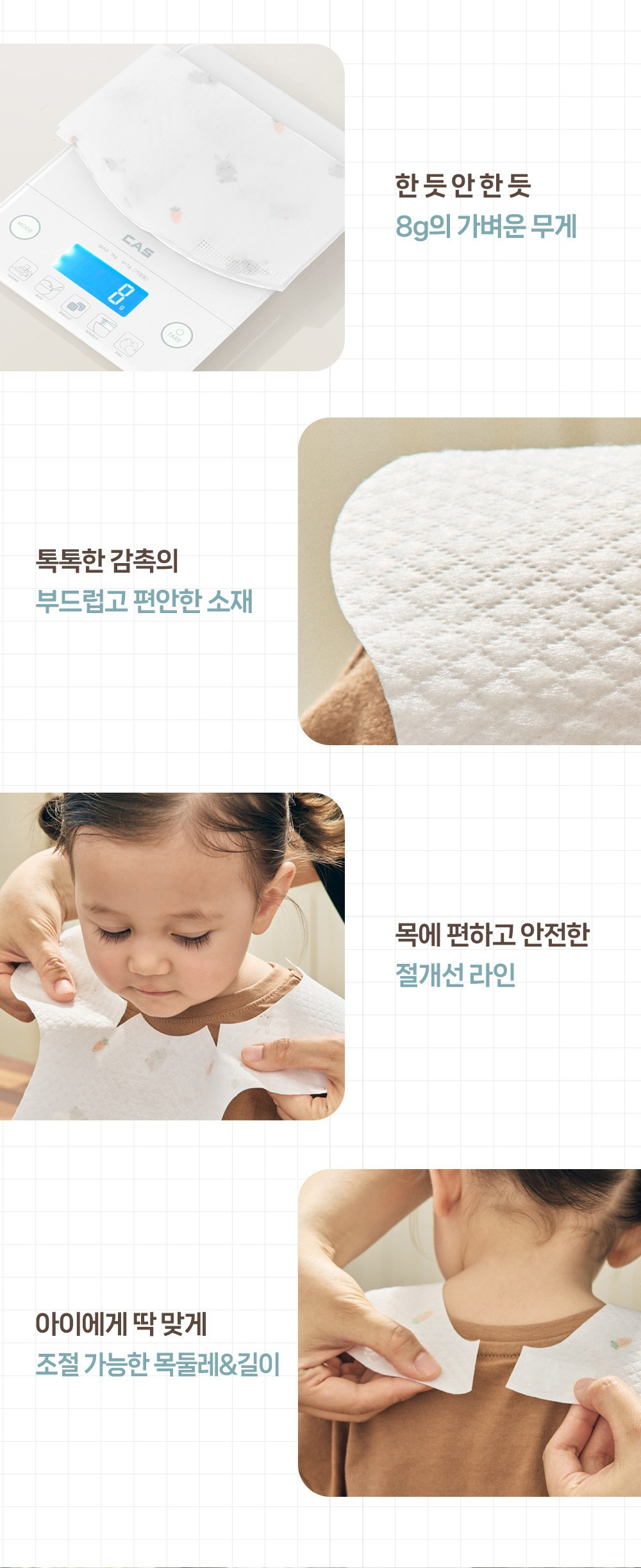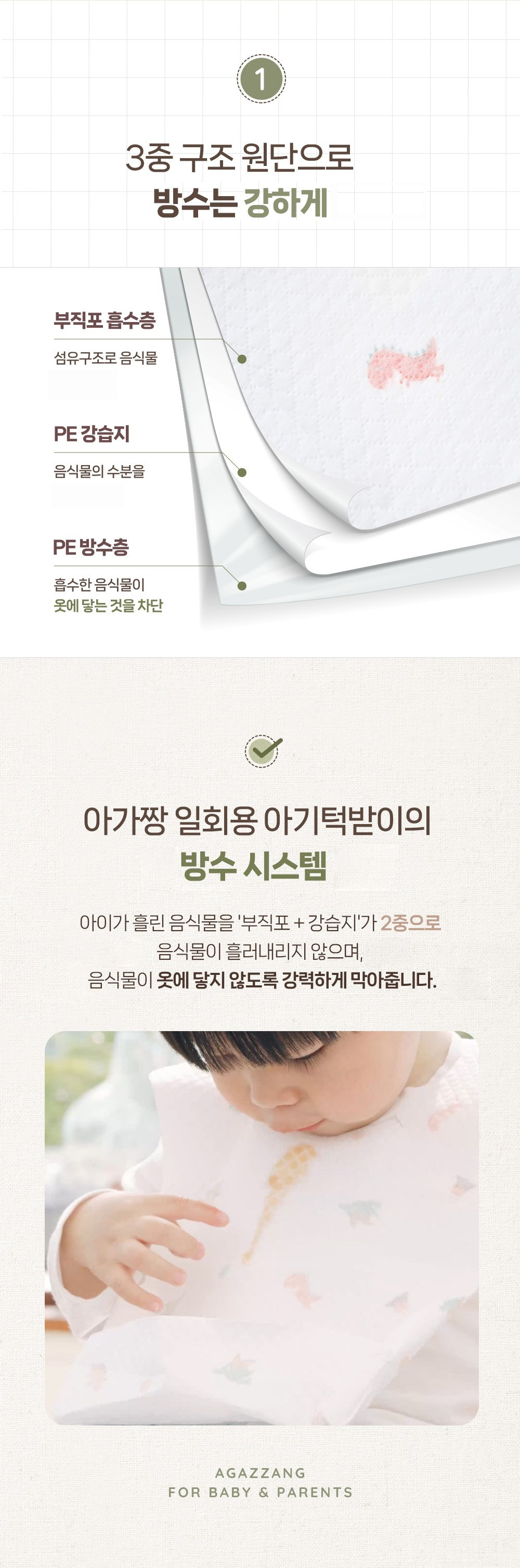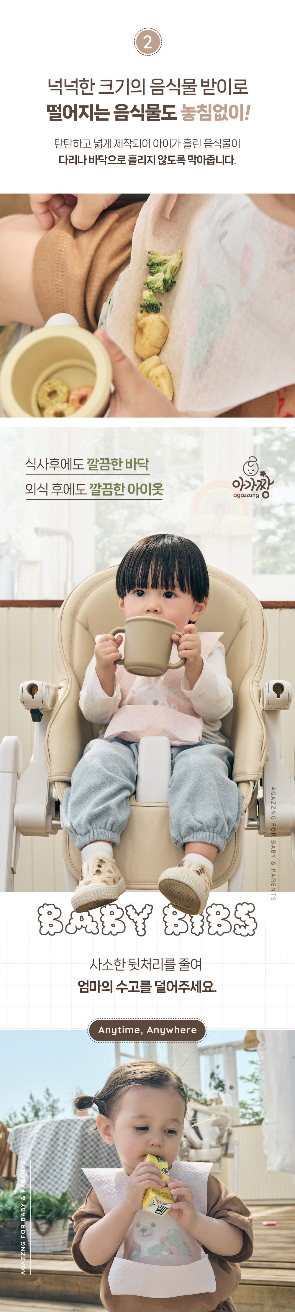 - 우수한 흡수력: 두꺼운 소재로 이유식을 잘 흡수하여 옷과 의자 보호됨