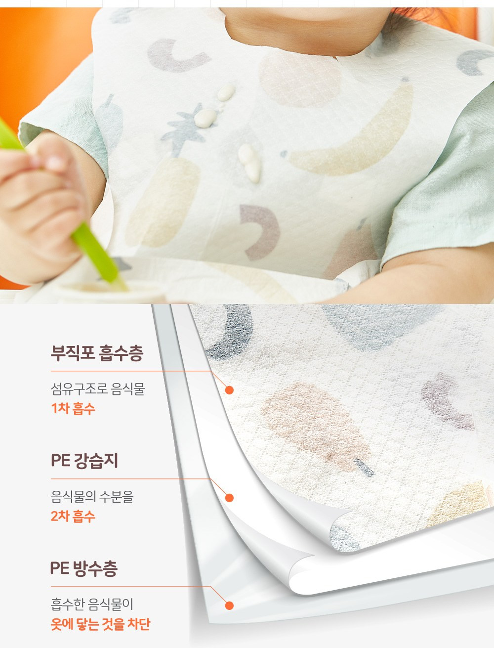 - 방수 기능: 음식물이 흘러도 옷이 젖지 않음