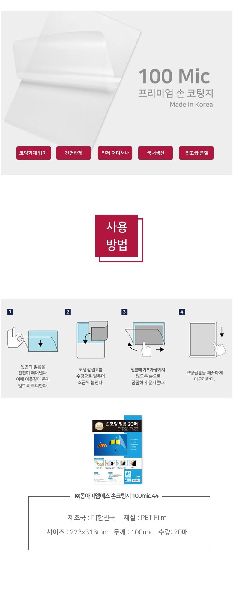동아피엠에스 손코팅 필름 100mic, A4, 20개