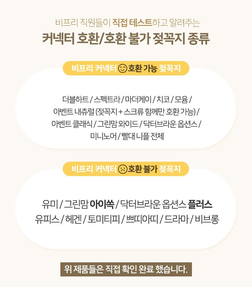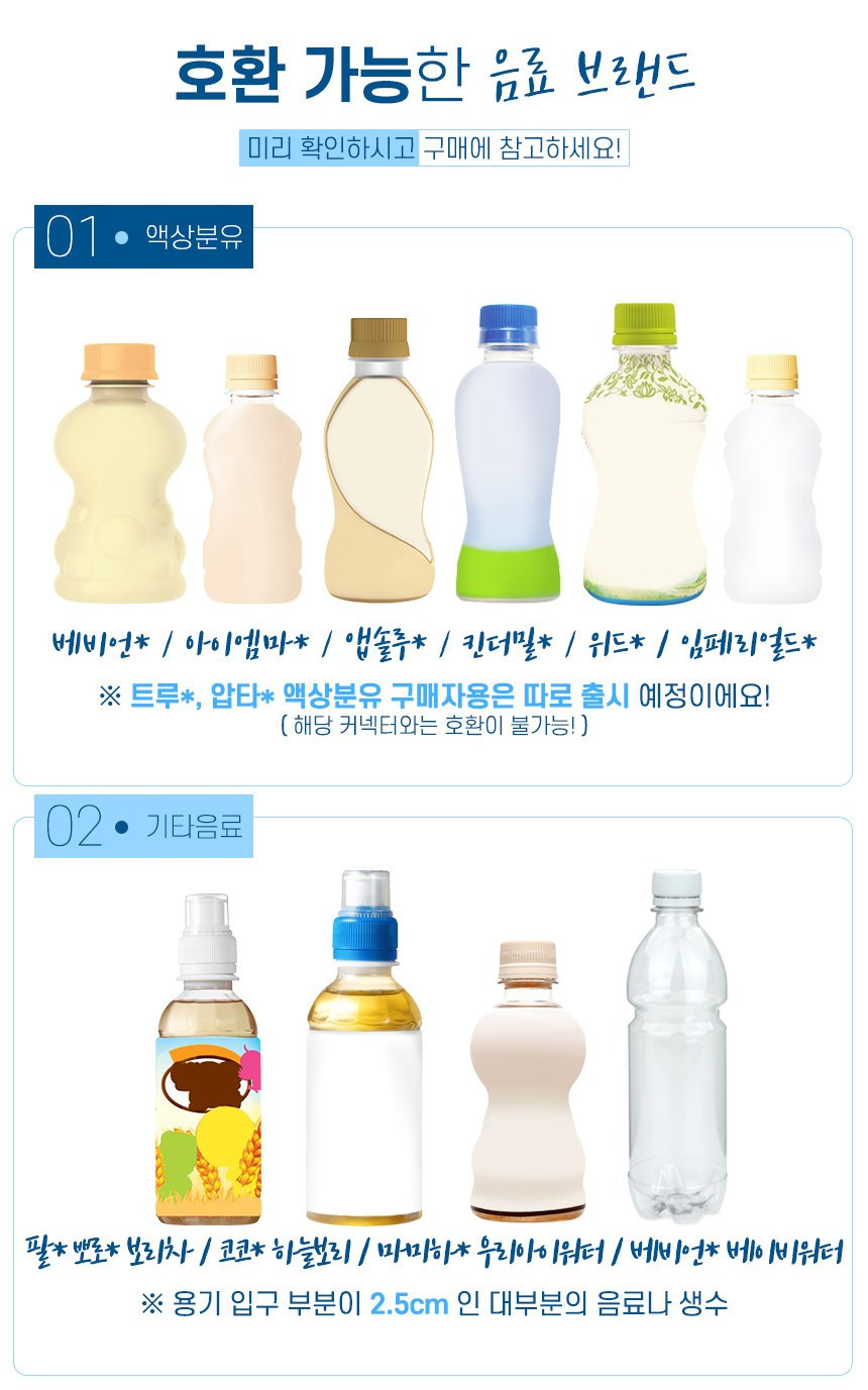 - 호환 젖꼭지: 기존에 사용 중인 젖꼭지가 호환되는지 사전 확인 필요함