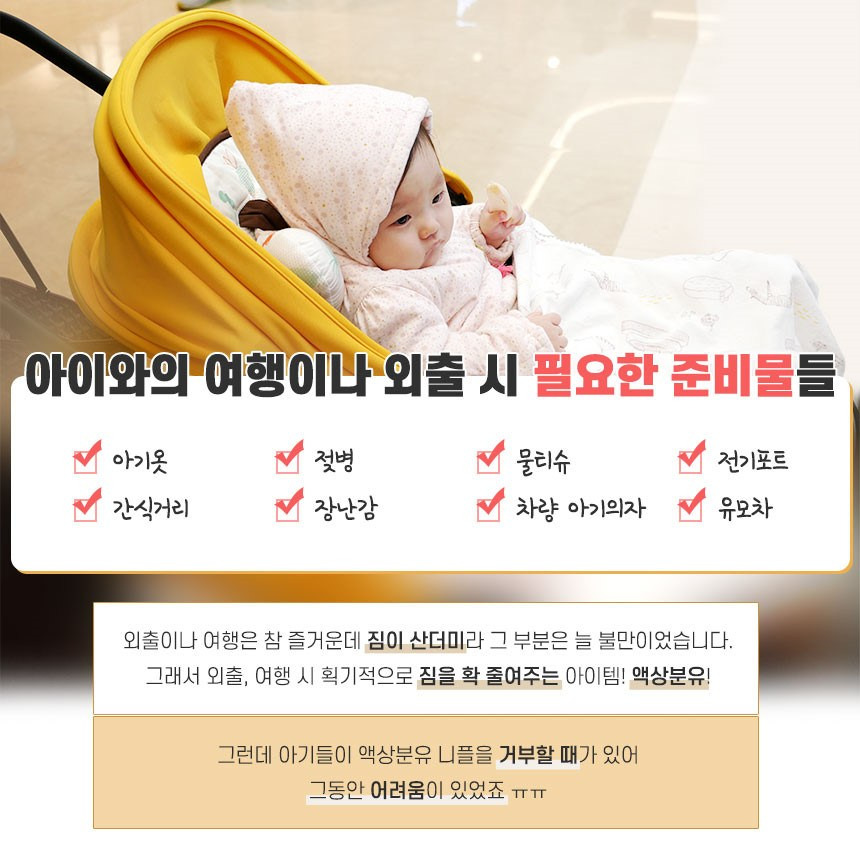 - 부피 절감: 기존 보온병이나 젖병 없이 간편하게 사용할 수 있어 짐이 줄어듦