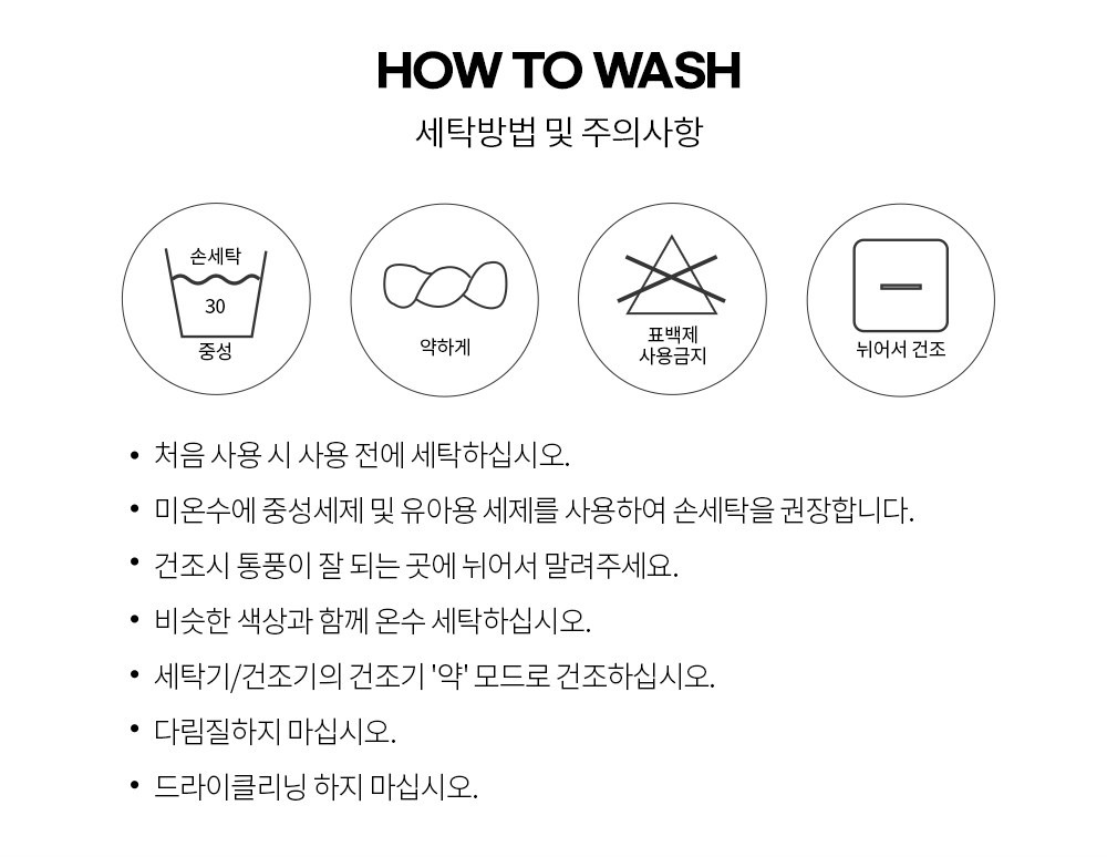 - 세탁 방법: 세탁 시 저온 세탁 권장, 드라이클리닝 피해야 함