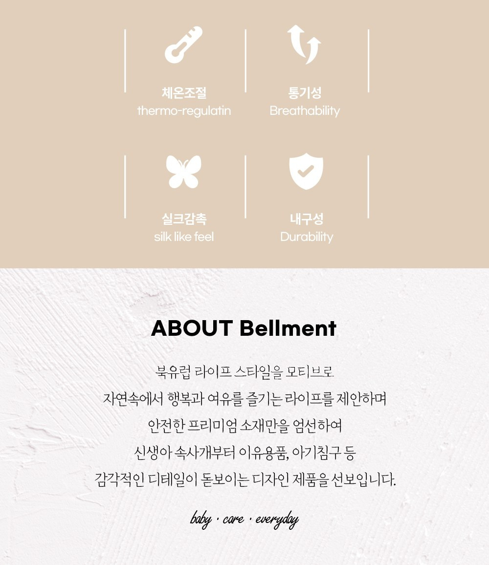 - 부드러운 소재: 뱀부 코튼으로 촉감이 매우 부드러워 아기 피부에 자극이 없음