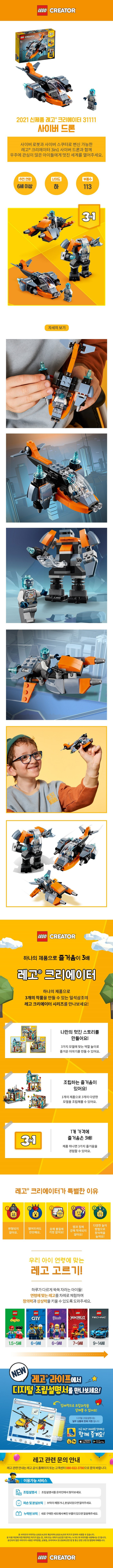 레고 크리에이터 3in1, 사이버드론, 변신 로봇, 조립 완구, 어린이 선물, 창의력 개발, 집중력 향상, 소근육 발달, 가성비, 교육 완구