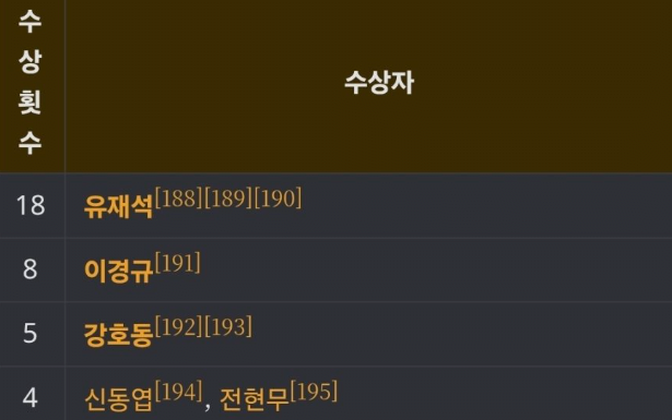 + 유재석은 백상 2회, 강호동은 백상 1회 수상 합치면 각 20회, 6회