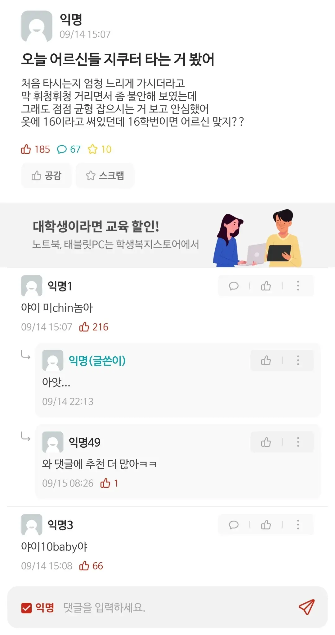전동킥보드 타는 어르신을 보고 걱정하는 대학생.jpg