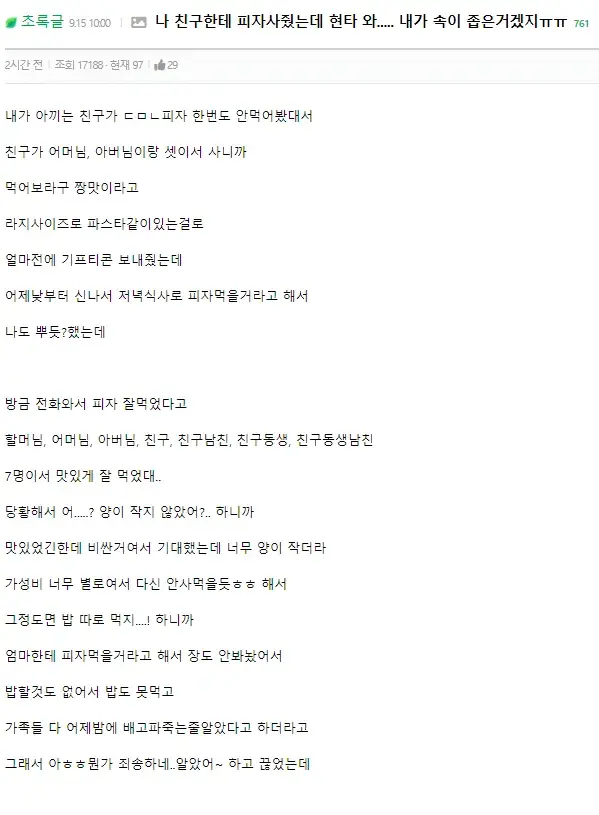 - 피자한판으로 귀한친구 잃네 ㅋㅋㅋㅋ 누가 아무 사심없이 호의베푸는게 진짜 쉬운일이 아니라는걸 알아야할텐데