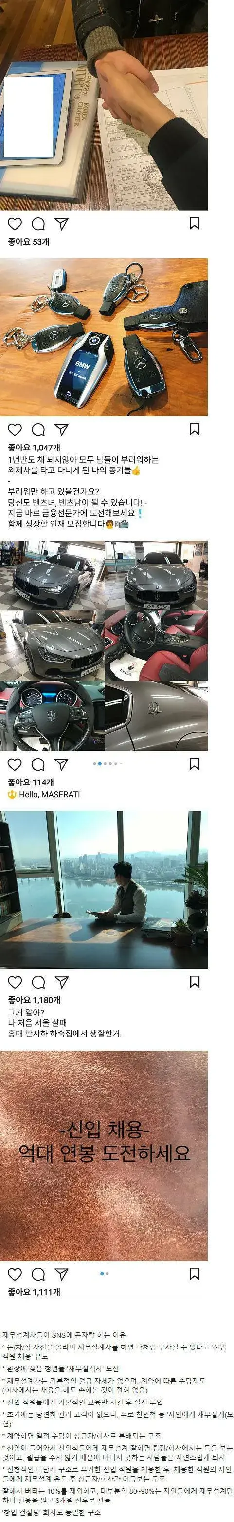 └ 걍 보험팔이임 재무관리사는 개뿔 대학도다니는둥마는둥하는애들이 뭔수로 일주일 교육받으면 재무설계관리자가 되는건지 ㅋㅋ 그냥 저렇게 꼬셔서 연금형 저축형보험팔이 하는거임 당연히 신입들이 지나가는사람붙잡고 보험팔수있을꺼같음?? 무슨 실비보험이나 자동차보험도 아니고 결국 친구 가족들꺼 지돈내고 가입하던가 가입해달라고 해서 처음에야 당연히 몇명가입시키고 일이백나오고 하니까 좀 많이 수명가입시키면 더 받을수도있고 근데 그게 끝임 더 이상가입못시키면 그냥 월급도없음 말이 좋아 재무설계자지 그냥 보험다단계임 옥장판 건강식품대신에 보험팜