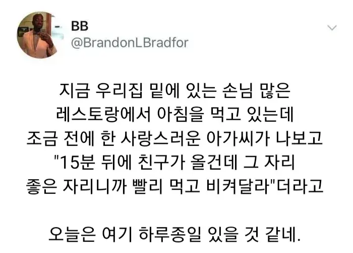 - 나도 비슷한 일 있었음. 코로나 터지기 1년전인가 맥날에서 앉아 있는 데 친구가 화장실 간 사이에 젊은대학생 무리들이 단체로 와서 옆에 자리를 잡더라구 근데 인원이 많아서 한 테이블로는 자리가 모잘랐음.