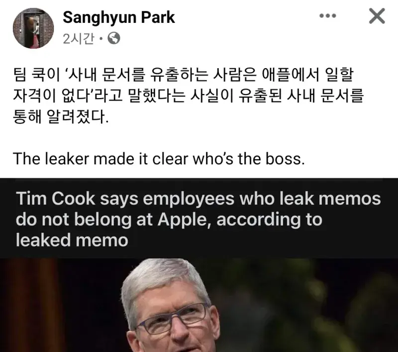 - 사내 팀쿡이 애플 사내 문서를 사내 말고 유출하지 말자고 애플 사내에 이야기 했는데 애플 사내에 있는 한 사내가 사내 문서를 유출했고 그 사내 문서 유출한 것 중에 애플 사내 문서를 유출하지 말자는 내용이 있었다는 에라이 싯팔 이게 사내?
