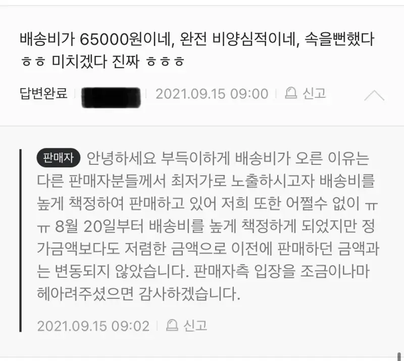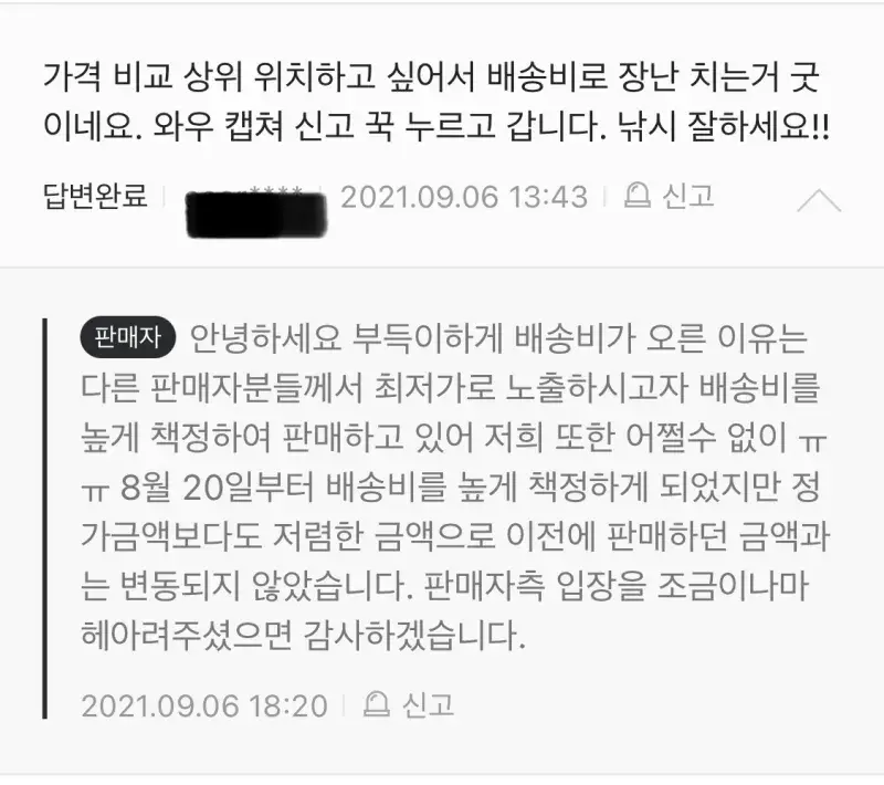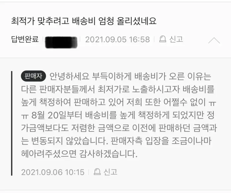거기에 복붙으로 달린 판매자의 답변. “다른 판매자분들께서 최저가로 노출하시고자배송비를 높게 책정하여 판매하고 있다” ?