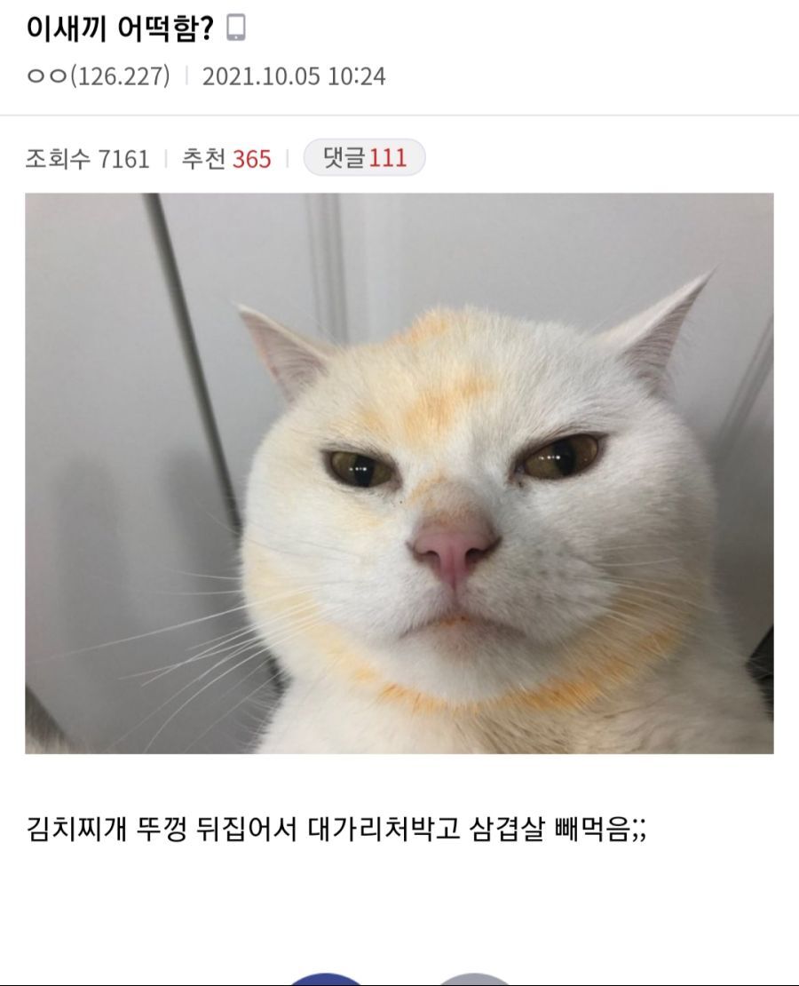 - 털이 원래 저런 게 아니라 김치국물 물든거여? ㅋㅋㅋㅋ