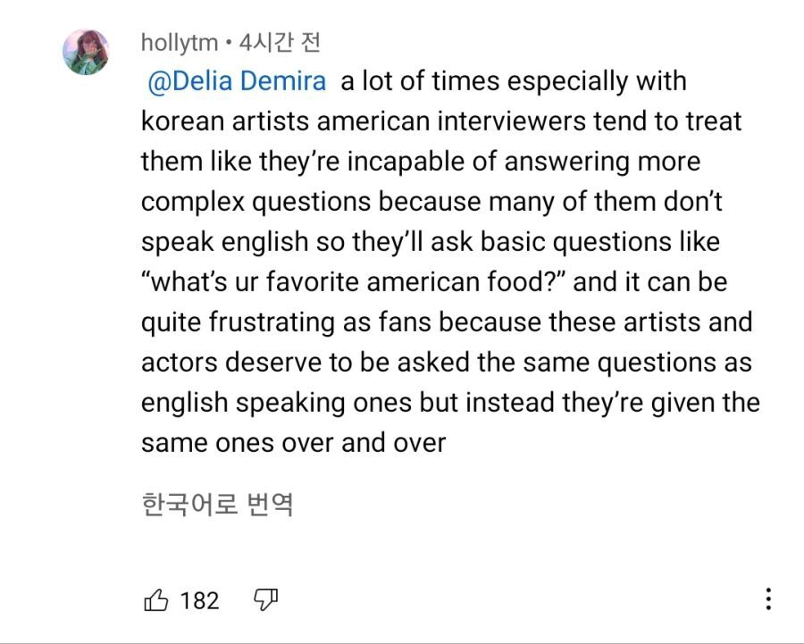 "맨날 미국인 인터뷰어들은 한국 아티스트들 대부분이 영어를 모른다는 이유로 가장 좋아하는 미국 음식이 뭐냐는 기초적인 질문같은 거나 하는데 팬들에게는 실망스럽다고 맨날 그런 똑같은 질문만 하고 또 하지 좀 말고 미국인들한테 묻는것과 똑같은 질문을 해라"