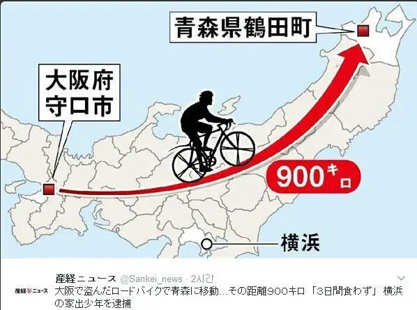 오사카에서 훔친 자전거로 아오모리까지 900km를 3일간 먹지 않고 달린 요코하마 출신 가출소년(18세)이 체포.