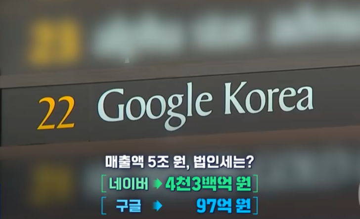-지난해 5조원이 넘게 매출을 올린 네이버는 세금을 4300억원을 냈으나 비슷한 규모로 추정되는 국내매출을 가진 구글은 세금을 97억원만 납부함. (매출 대부분을 법인세율이 우리보다 낮은 싱가포르로 돌려 신고했기 때문)
