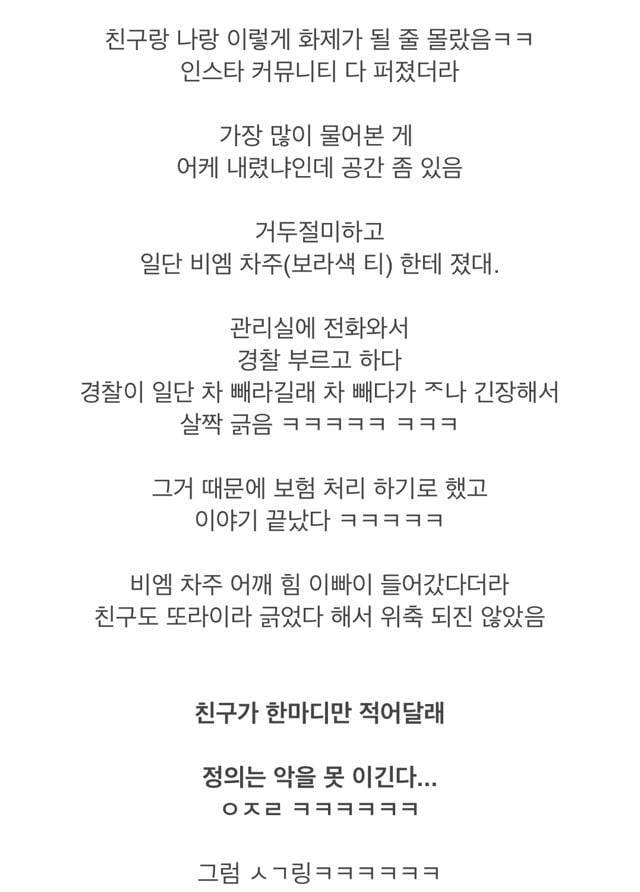 - 경찰이 경차보고 빼라한거아님? 먼저뺼 의무가 없지않나 주차선 위반한건 bmw인데 ㅋ 배쨰고있었어야 하는거아닌가