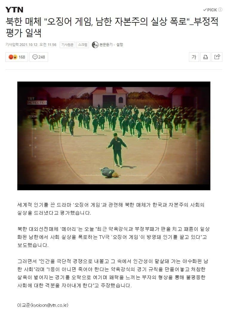 - 북한은 국가 전체가 오징어 게임이자너 ㅋㅋㅋㅋ 첫번째 게임은 고난의 행군입니다. 두번째 게임은 정치범 수용소에서 살아남기입니다.