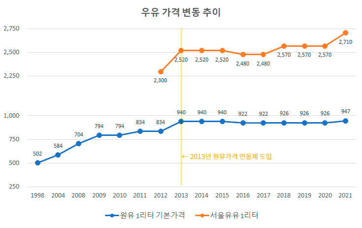 사실이기도 하고. 하지만 업계가 담함해서 우유가격을 올리고 있다거나, 우유가격이 빠르게 오르고 있다는 주장은 적어도 우유가격 연동제 도입 이후로는 사실이라고 하기 어렵습니다. <참고링크 몇 가지>