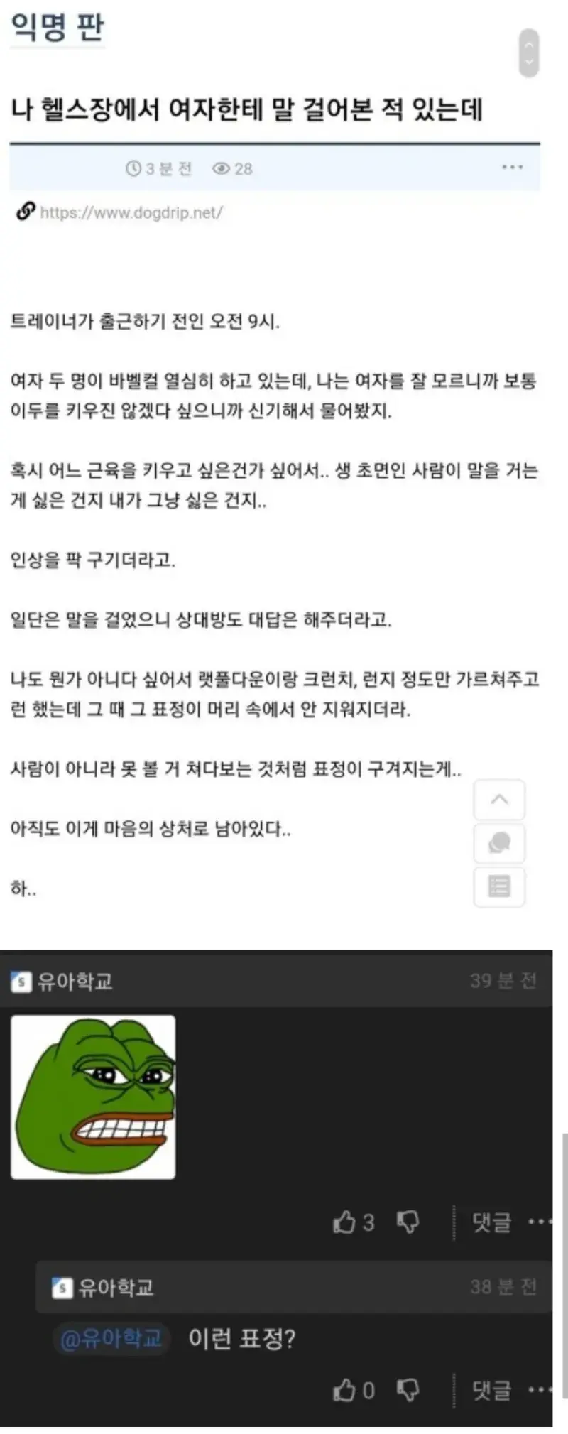- 생긴것보다는..저사람이 누군지도 모르고 얼마나 운동을 잘하는지도 모르는 상태에서 초면에 내 운동에 참견하는게 불편할거같음 인사라도 몇번 하는 사이면 모르겠지만