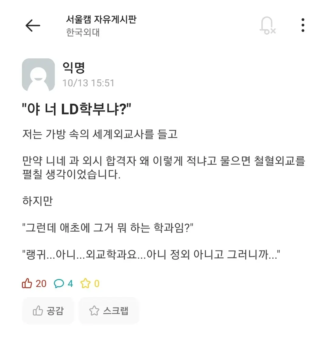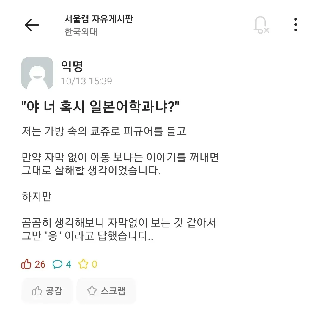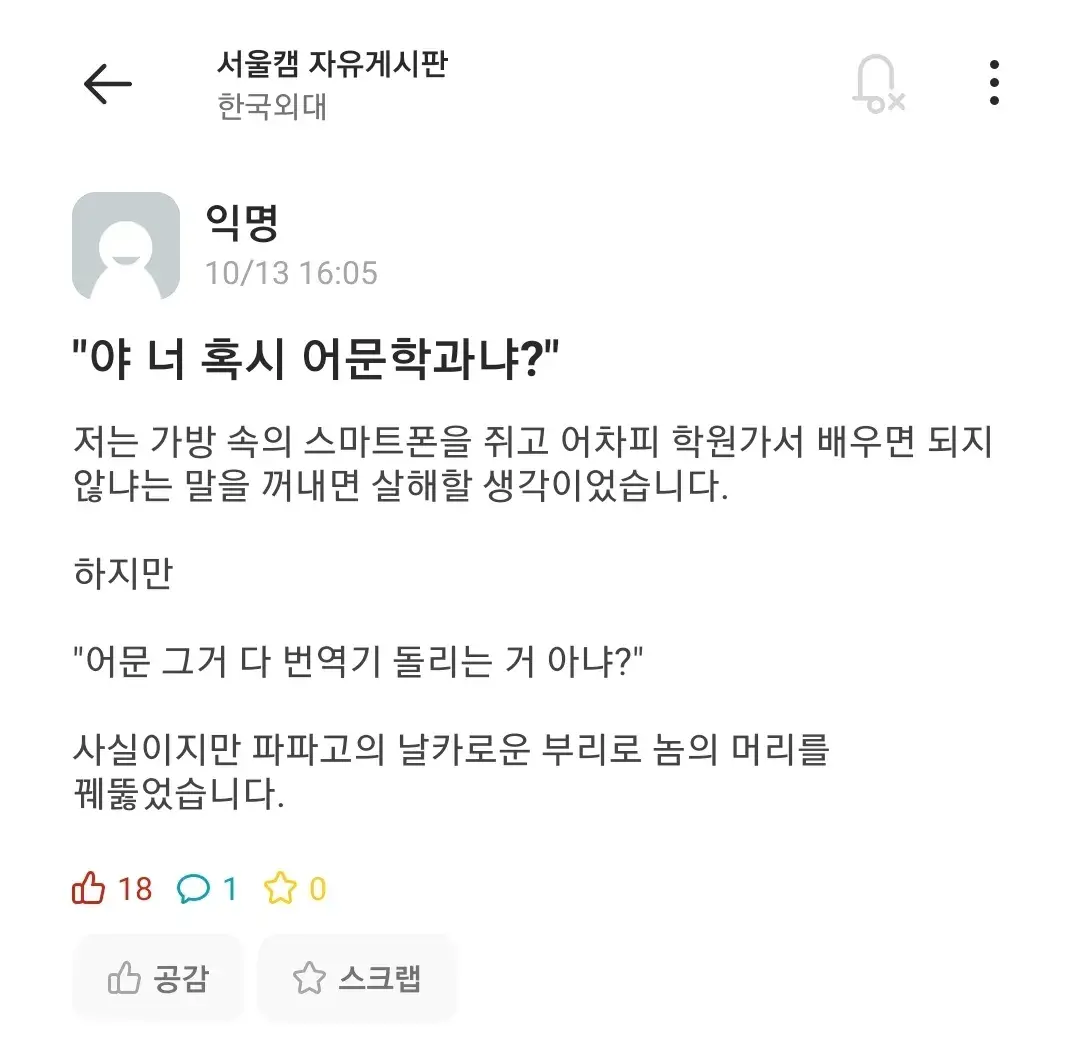 / 저는 가방속의 몽키스패너를 들고 만약 니네 과 취업 잘 된다며라고 물으면 그대로 머리를 내려칠 생각이었습니다.