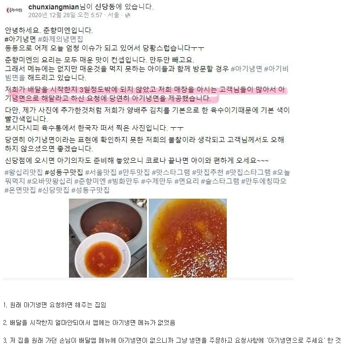 결국은 아기냉면이라는 메뉴는 해당매장에 원래 존재하는것이었고