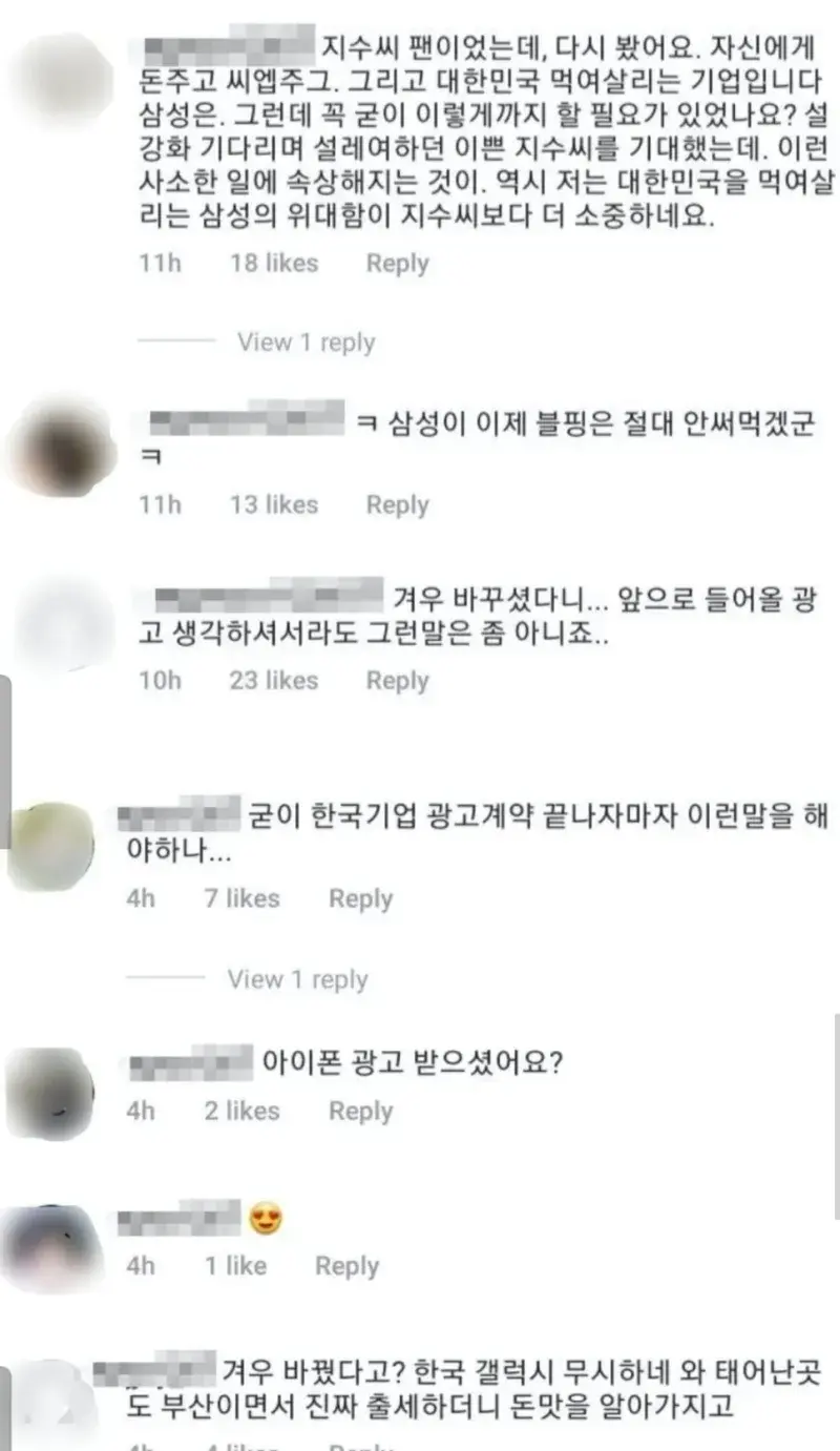 - 블랙핑크는 2019년 7월부터 2020년 8월까지 삼성 갤럭시의 광고모델이었다. 지수는 계약기간이 끝난 뒤 2021년 1월부터 아이폰 12를 사용했으며 최근에 품귀현상이 있었던 아이폰13으로 기변하며 '와우 겨우바꿨다'라는 인스타를 올렸다. 뭐가 문제?
