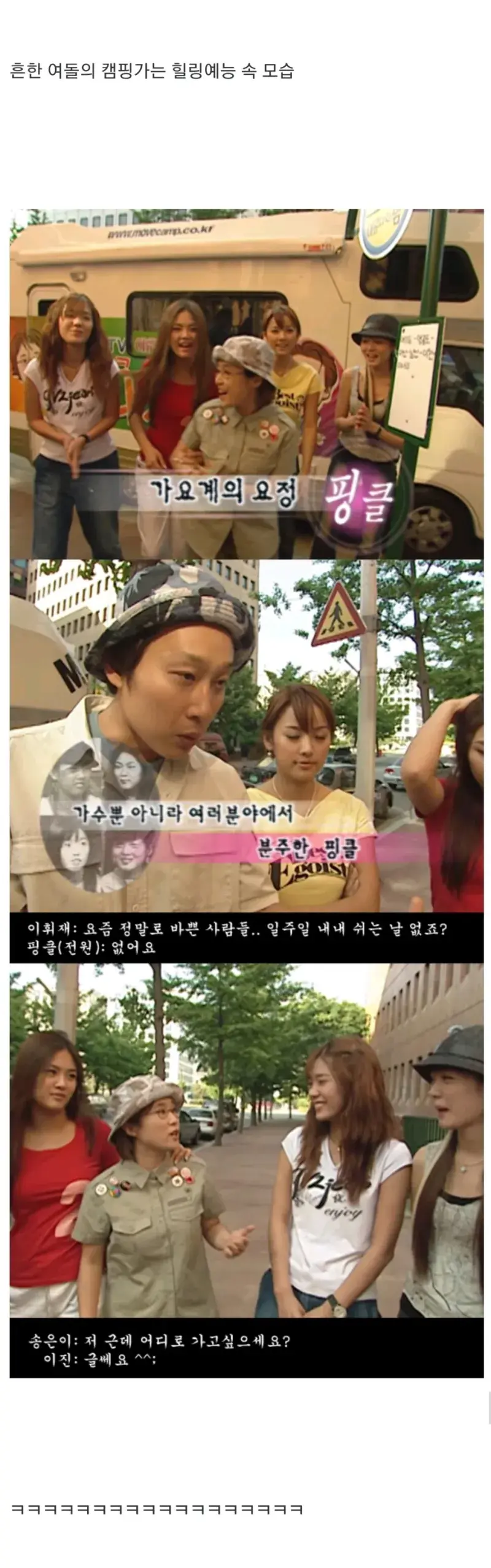 - 핑클멤버들이랑 강호동이랑 같은차 타고가고있는데 커튼같은걸로 나뉘어졌다고 그랬나?그당시에 강호동이 담배피우던 시절인데 차안에서 담배피우니까 옥주현이 "누가 담배를 펴!!!"샤우팅한 썰도 웃겼었는데 ㅋㅋ