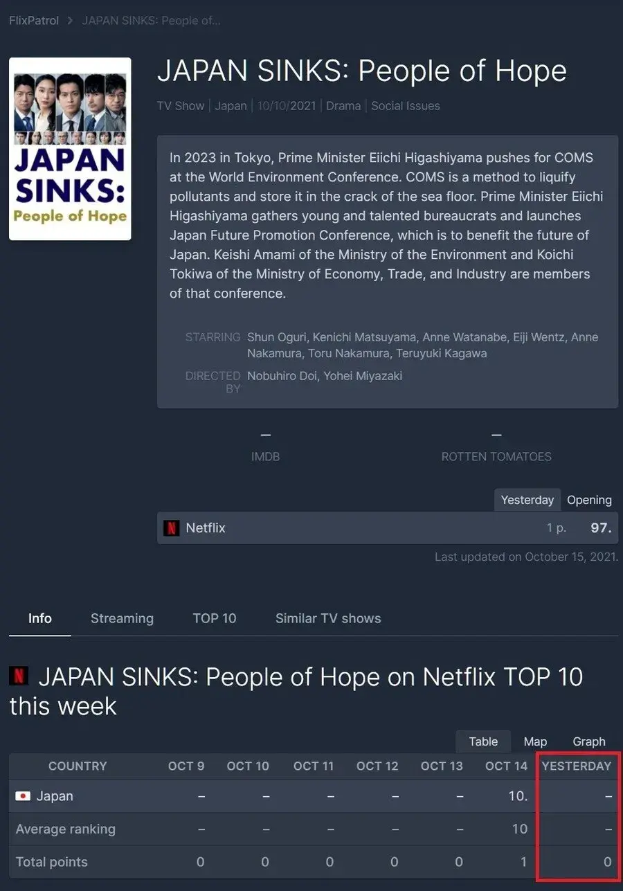 방송국과 넷플릭스에 빠른 타이밍으로 올리는 것이 한류 수법이라는 일본본인들도 그 방법을 따라해서 세계에 진출한다고 대놓고 말했던 '일본 침몰'현재 차트 OUT 0 POINT
