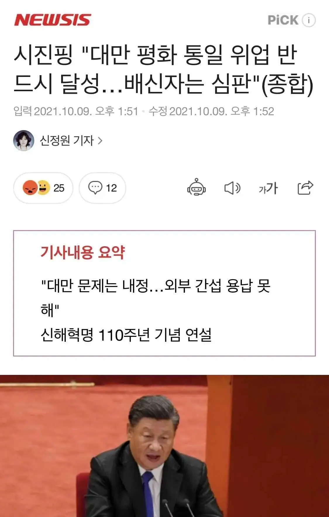 산해혁명 110주년 기념연설에서 기필코 대만과 흡수통일 하겠다고 말한 시진핑 중국역사상 무력을 사용한 흡수통일을 언급한건 시진핑이처음이후 중국은 현재 끊임없이 대만 상공과 맞은편 섬에 대규모침공 훈련을 감행중..