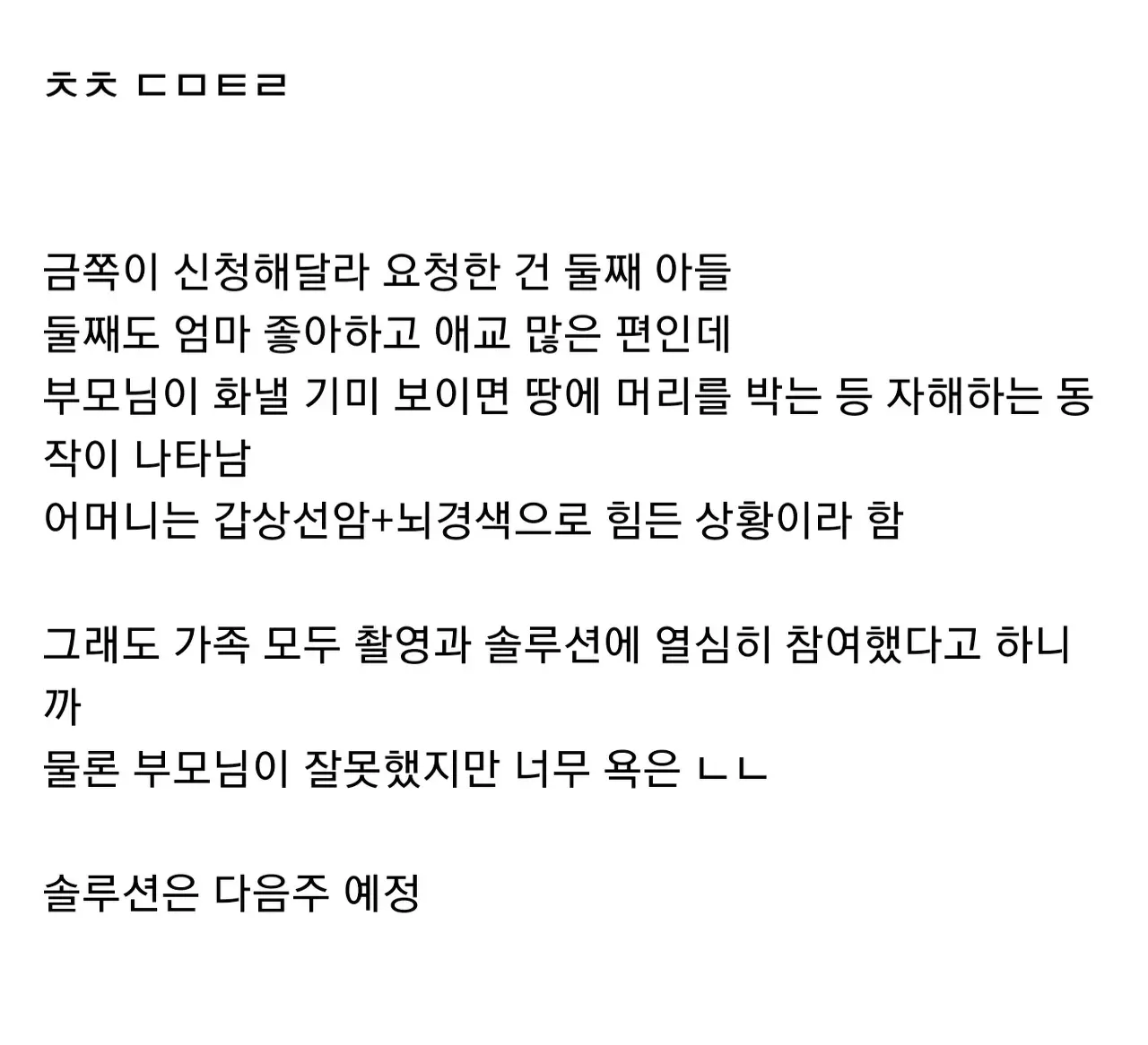└ 그니까. 본인이 첫째한테 하는 취급이 다르다는 걸 인지하고 있다는 거잖아. 근데 무슨 감정이 어쩌고 하면서 본인을 변호해. 아무리 봐도 학대구만.