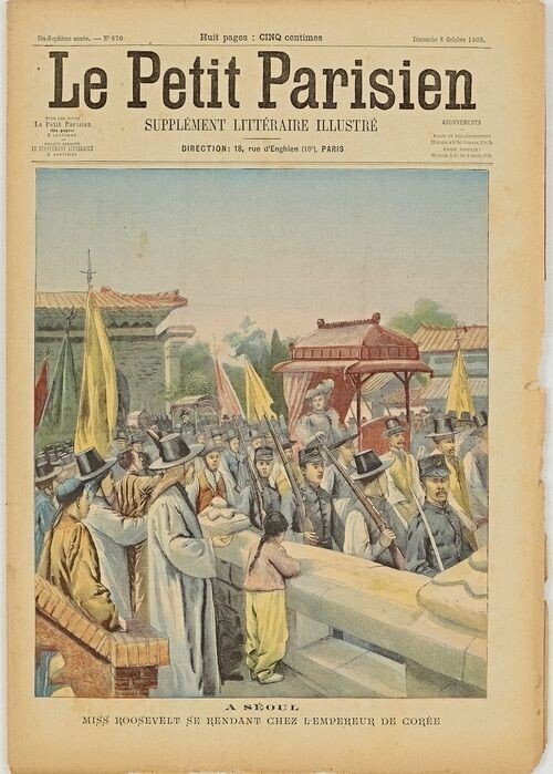 《오지리국 합씨부가와의 국혼으로 새색시를 맞이하는 조선인들의 모습. 오지리국은 노서아 견제를 위해 조선과 혼인동맹을 맺었다. 조선 산포수 엽병근위대가 새 왕후를 호위중이다.》