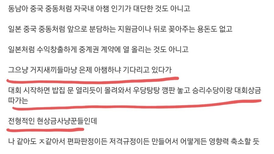 - 축구에 관심 있는 기업들은 K리그 팀을 직접 운영하니까 더 안하는거 같더라