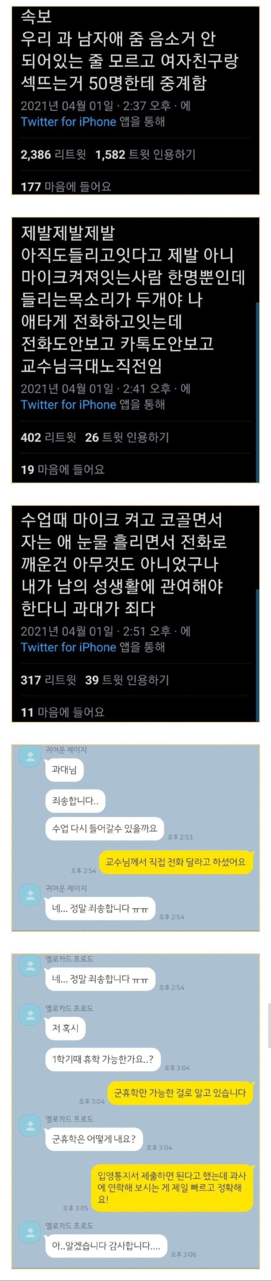 - 본문에 비하면 약과긴한데 나 듣는 강의에서 한 놈이 마이크 켜진것도 모르고 친구하고 통화하는 헤프닝이 있었는데 강의 소리는 꺼놔서 교수님이 마이크 끄라는것도 못듣고 있는것은 물론이요 강의 켜놓고 게임하고 있다는 말, 교수 욕하면서 강의 존노잼이라 안듣는다고 하는 말 그대로 중계되서 교수님 극대노해서 전화걸어서 왜 비싼돈 주고 내수업 듣고있냐고 나가 라고 하고 존나 살벌했었…