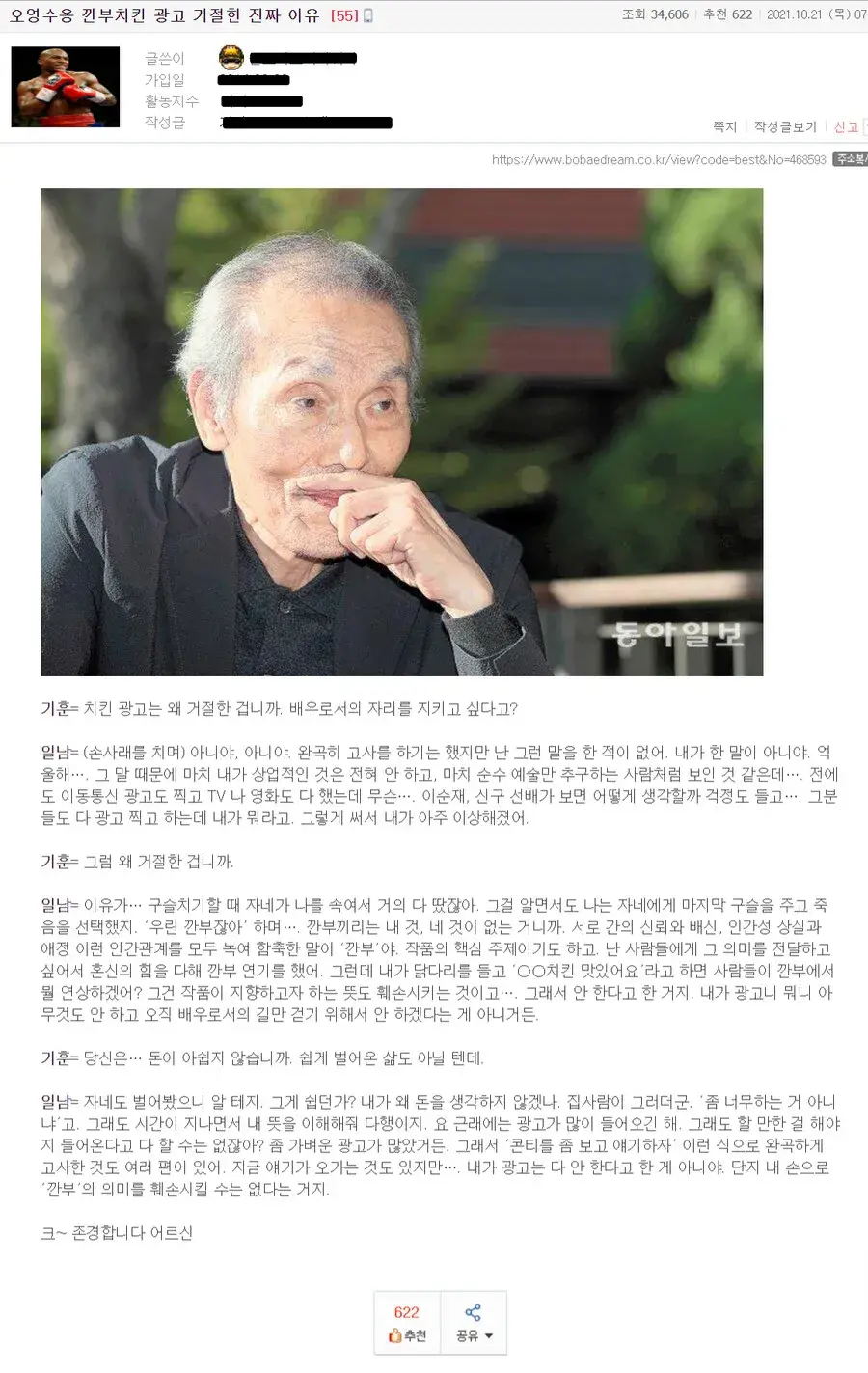 오영수선생님이 깐부치킨 광고 거절한 진짜 이유