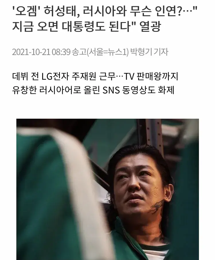 - 허성태 러시아 유학이야기 웃기던데. 생긴게 험악하지만 싸움 못하는데. 가자마자 러시아애가 불러서 나갔더니 싸우자고 해서 못한다고 자기가 미안하다고 했는데. 그냥 쳐맞음. 나중에 때린 러시아애가 미안하다 그러고 친하게 지내자고 했는데. 그냥 쭈구리로 있었다고