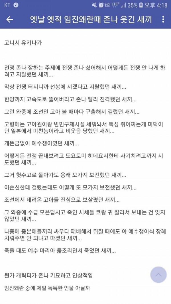 - 진지하게 따지자면 귀 코 베는거 그거 나쁜짓인데 자기들 밑에 딸린 부하들 먹여살려야 하는데 전공 신청 안 하면 떡고물이 안 떨어지니까 먹여 살릴 수가 없잖아 그래서 했겠지 전쟁나서 장사도 못하니까 근데 얘는 할복 하라고 했을때 기독교인은 자.살은 안 한다 해서 참수 당한 애임