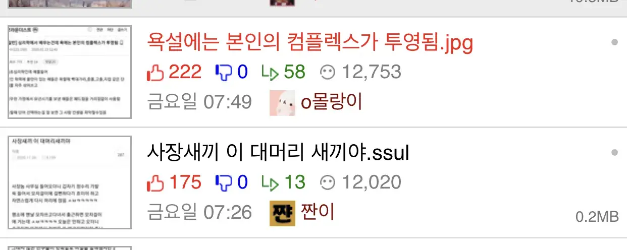 - 와 놀래라. 니 가슴 무슨 자라 대가리 같냐ㅋㅋㅋㅋ / 뭐래 지는 솥뚜껑 마냥 납작한 주제에