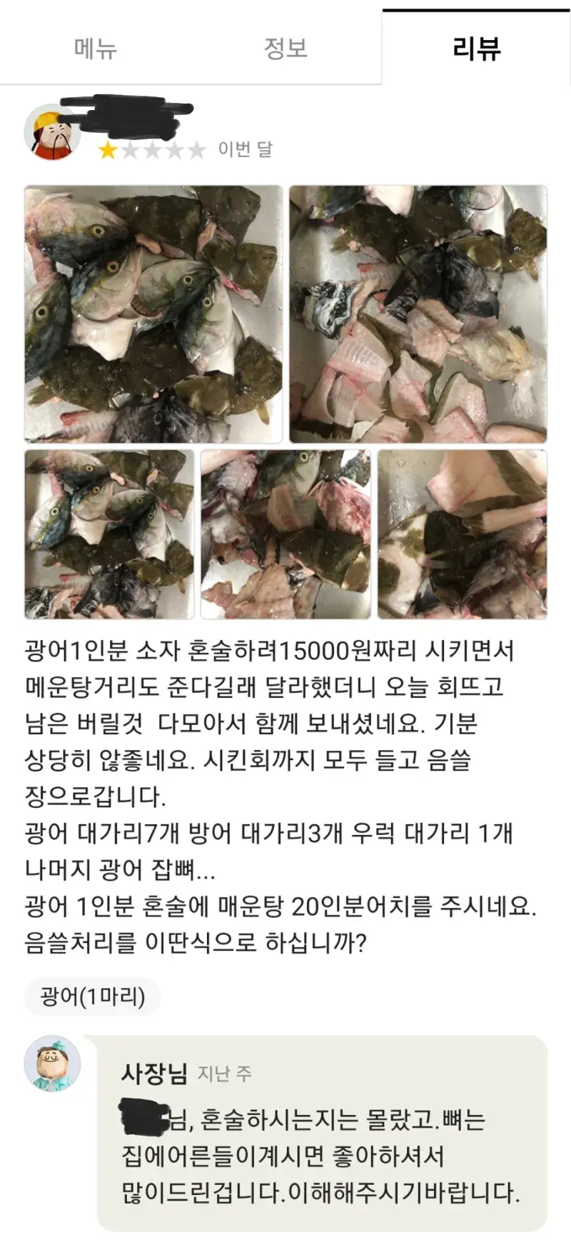 1. 진짜 매운탕거리로 준다고 했어도 시킨 회양에 비례해서 주지 저딴식으로 안보냄