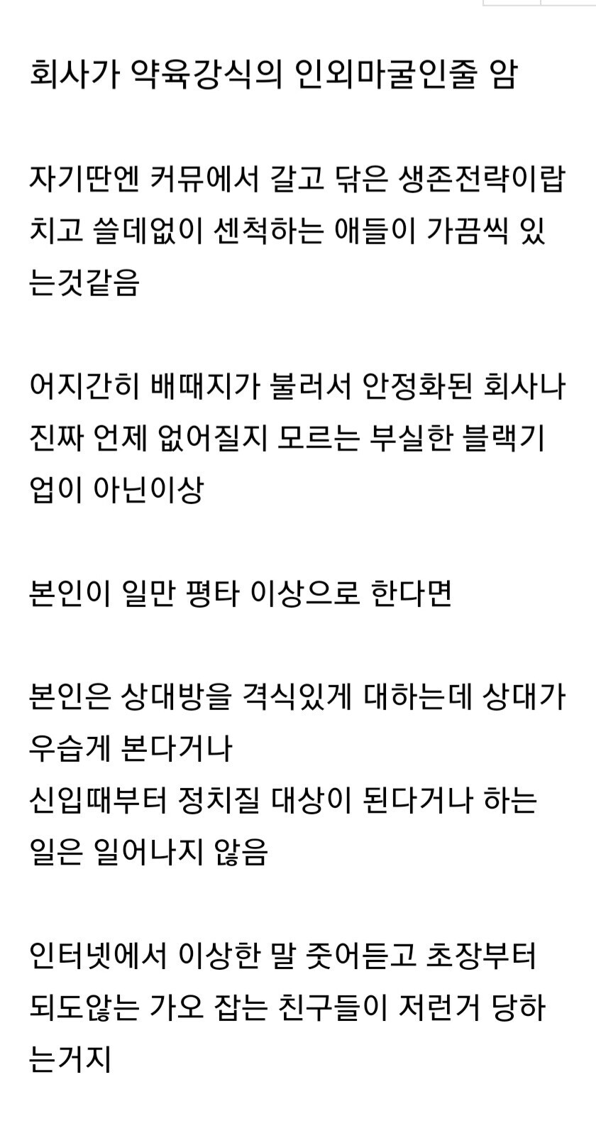 - "일만 평타 이상으로 하고 상대방을 격식있게 대하면" (중요) 본인부터 이 것도 안 하고 그냥 회사 사람들 ㅈ같다고 말하는 애들 간혹 있다