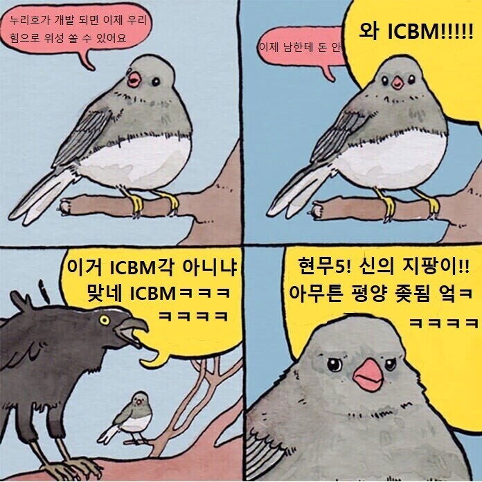 - 맨날 누리호 누리호 얘기만 해도 ICBM 드립만 나오지 그걸로 뭘 할진 아무도 신경 안 씀 결국 말만 과학발전이네 뭐네 포장하지 실상은 기초과학 천대하는 전쟁광들하고 다를 게 없음