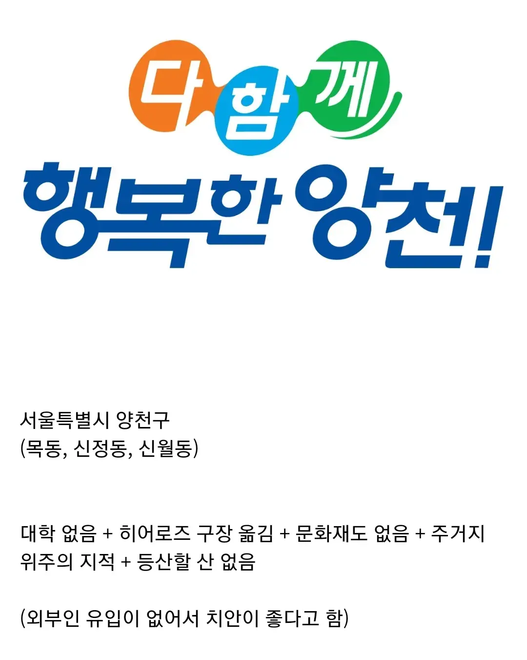 - 오늘도 친구들하고 밥 먹으려고 30분 걸음... 밥 먹을 데가 없어... 놀 데가 없어서 목동 애들 손잡고 합정이나 홍대, 강서구청 가서 놈 ㅋㅋㅋ 이 동네는 제일 위험한 유흥시설이 피시방인 곳임. 어렸을 땐 피시방 짓지 말라고 시위하는 학부모들도 많이 봄. 대신 사건 사고가 없고 살기 편해.